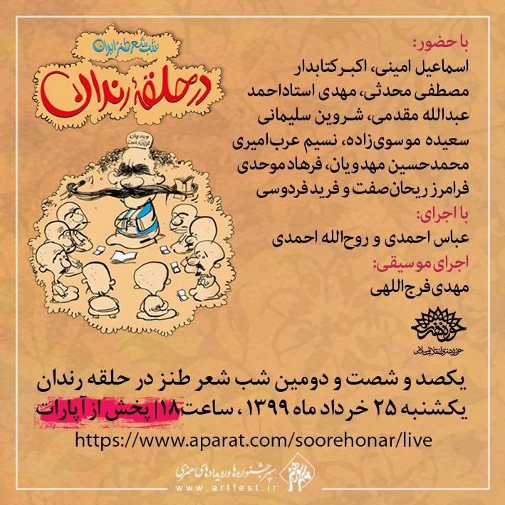 «در حلقه رندان» به همت موسسه فرهنگی و هنری سپهر سوره هنر و دفتر طنز حوزه هنری برگزار میشود. همانگونه که پیش از این گفته شد؛ جهت پیشگیری از شیوع بیشتر بیماری کرونا در حلقه رندان به صورت حضوری پذیرای ادب دوستان گرامی نخواهد بود و علاقهمندان میتوانند این برنامه را در ساعت مقرر از طریق سایت آپارات ببینند.