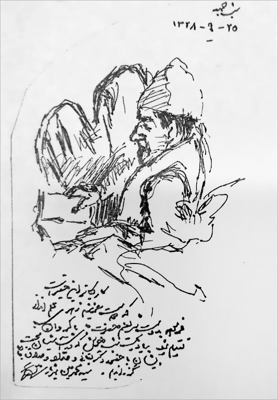 «کاریکاتور این حقیر است که دوست عزیزم زهری قلمانداز فرموده به دوست شریفم حضرت آقای پاکروان تقدیم میشود به یاد یک شب خوش که در آشیان محبت ایشان با حضور دکتر بقایی و حداد و صادق جان گذراندیم.»