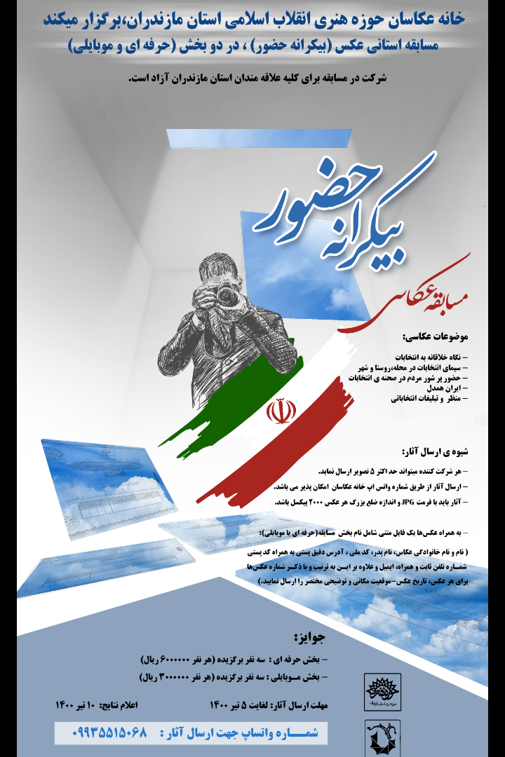 به گزارش روابط عمومی حوزه هنری مازندران، خانه عکاسان این مرکز مسابقه بیکرانه حضور را با هدف نمایش تمام عیار حضور مردمی، شور انتخابات و فضای حاصله از این رویداد در سطح استان برگزار کرد.