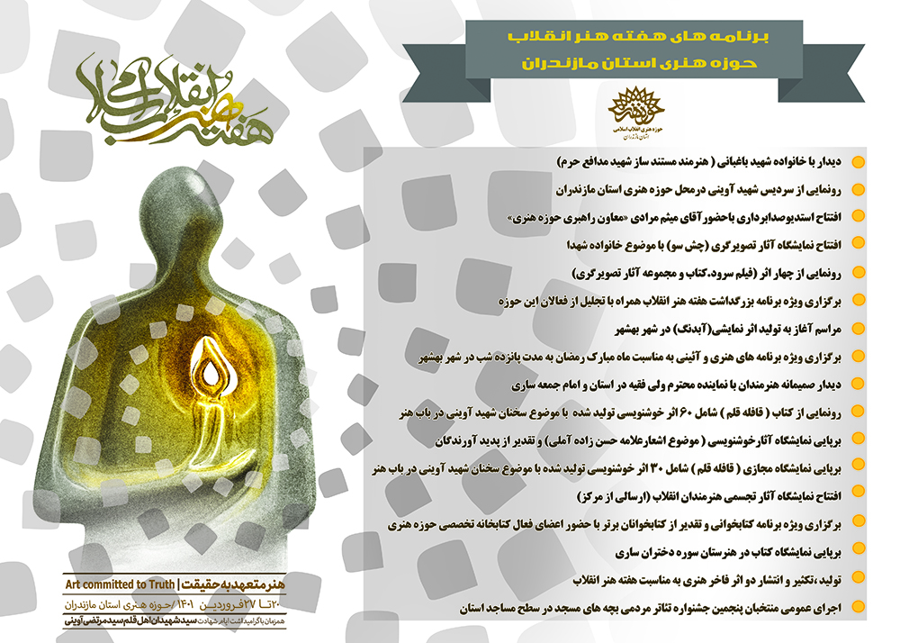 برنامه های حوزه هنری مازندران در هفته هنر انقلاب اسلامی بدین شرح می باشد: