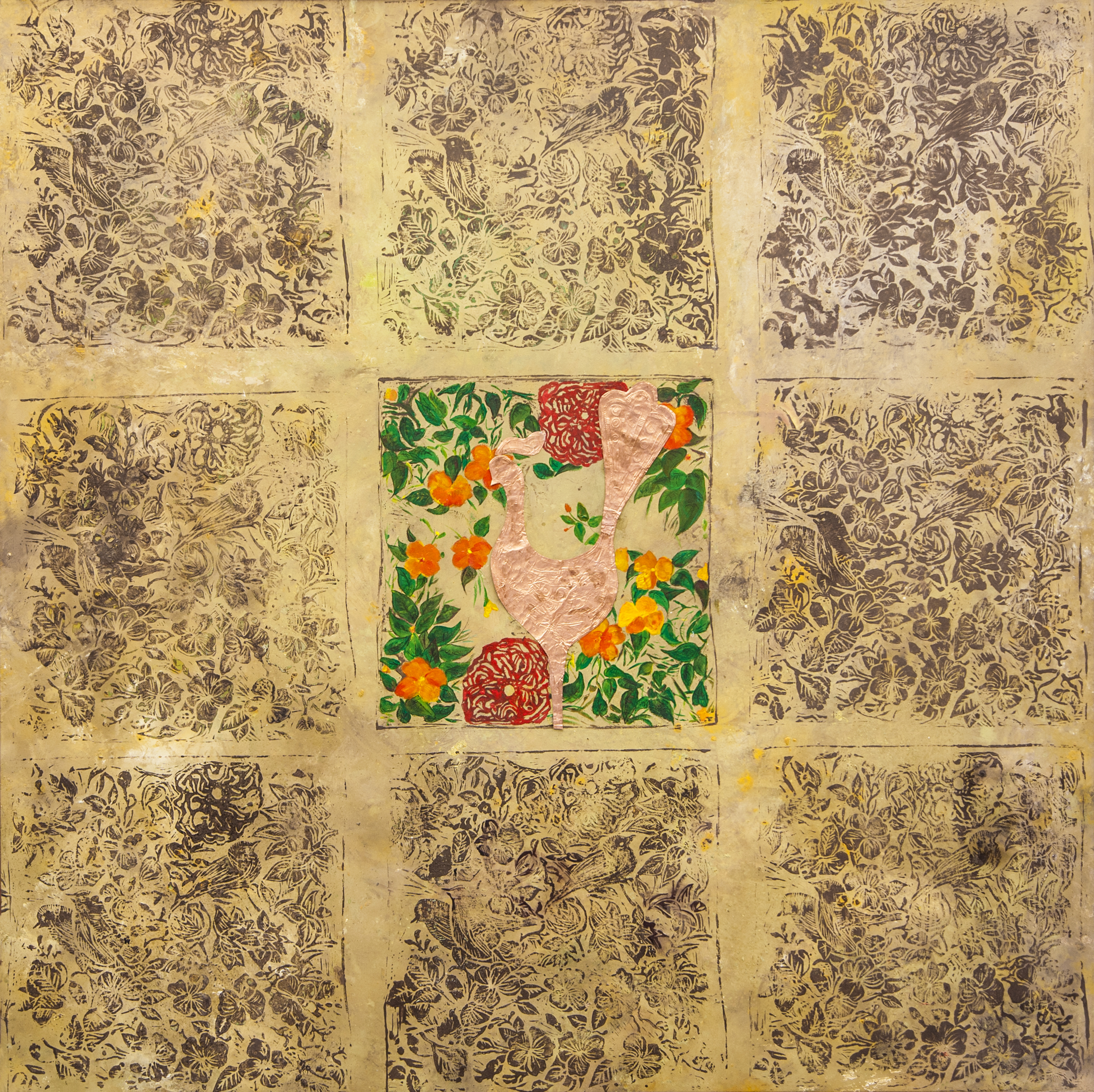 این هنرمند نقاش درخصوص تکنیک اثری که ارائه دادهبود گفت: این اثر را با تکنیک چاپ دستی خلق کردم چنانکه در جای جای اثر شاهد چاپ گل و مرغهایی با طرح دوره قاجار و پهلوی هستیم که در قابهای مختلف به رنگ خاکستری هستند، اما قابی که دارای نماد علم که نمادی از عاشوراست، در آن قرار دارد، طرح گل و مرغ در آن بخش رنگی میشود. به این معنا که با ورود نمادی از امام حسین (ع)، گل و مرغها رنگ بهشت میگیرند و از برزخ خارج میشوند.