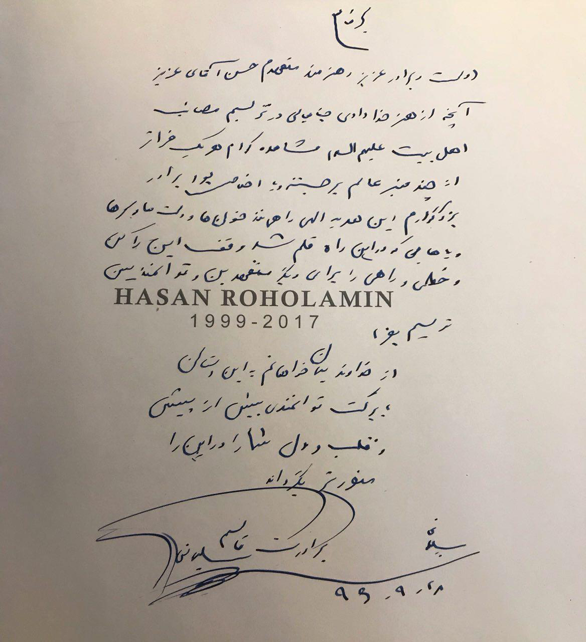 از خداوند منان خواهانم، به این دستان با برکت توانمندی بیش از پیش؛ و قلب و دل شما را در این راه منورتر بگردان. برادرت قاسم سلیمانی، ٩٦/٩/٢٨»