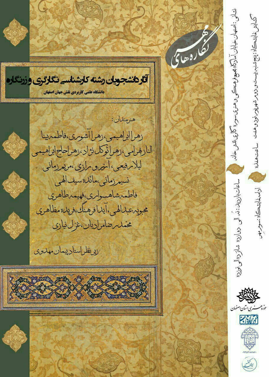 به گزارش روابط عمومی حوزه هنری استان اصفهان، وی با اشاره به افتتاح این نمایشگاه در ساعت 17 روز پنج شنبه 22شهریور در مجتمع فرهنگی هنری سوره واقع در خیابان آمادگاه گفت: این نمایشگاه با 50 اثر از کارهای دانشجویان ترم 3 و 4 رشته نگارگری و زرنگاره این دانشگاه که در ابعاد مختلف (بزرگترین آن 50 در 70 است) دایرخواهد شد.