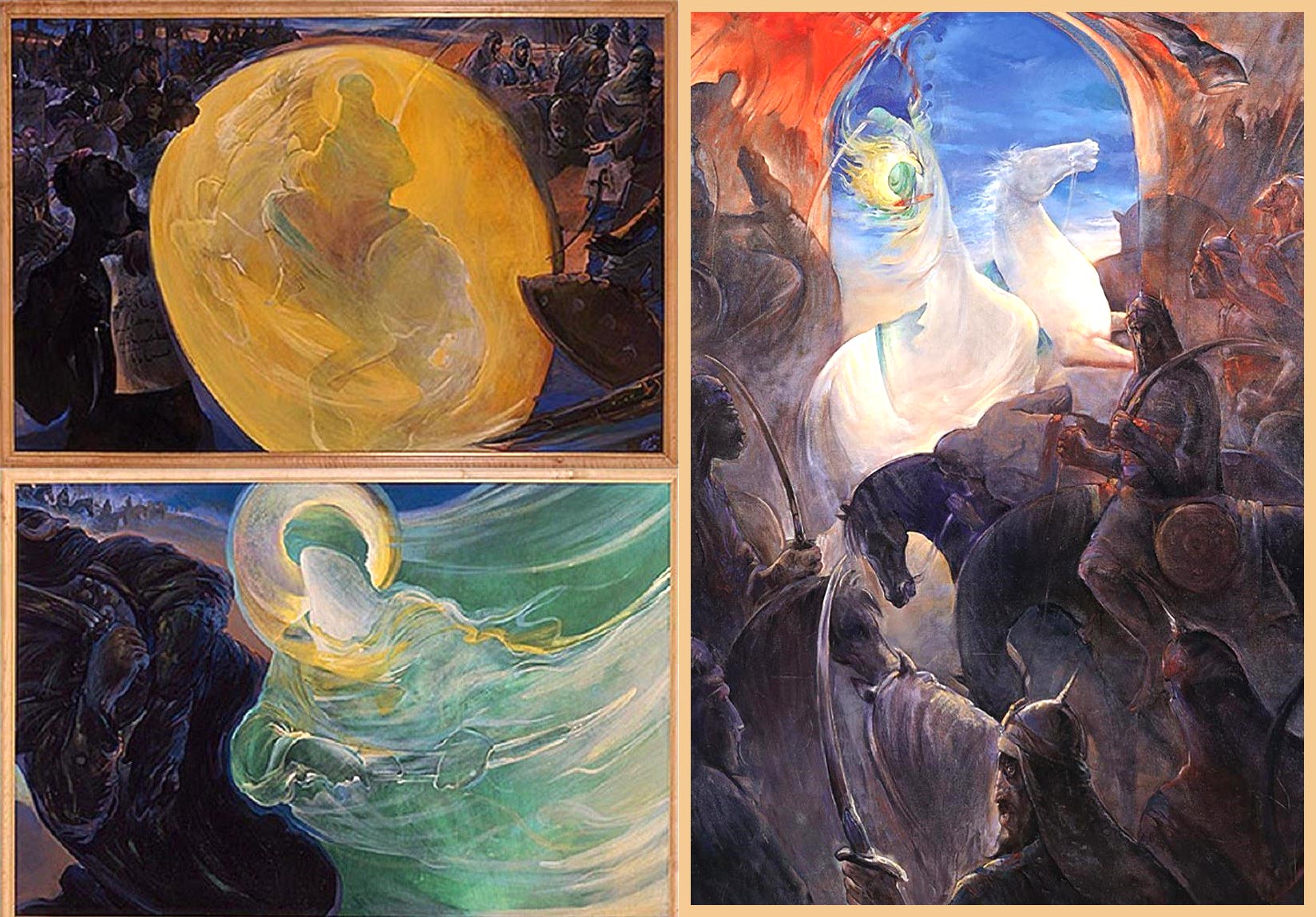اولیا چهره‌ای نورانی و آسمانی دارند و اشقیا با چهره‌های تاریک و کریه به تصویر کشیده می‌شوند به طرزی که می‌توان جدال نور و ظلمت را به وضوح در آثار صادقی دید