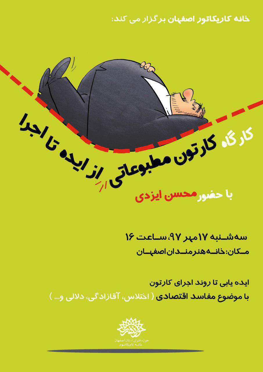 به گزارش روابط عمومی حوزه هنری استان اصفهان، این کارگاه با حضور محسن ایزدی کارتونیست خوب و فعال مطبوعات کشور در خصوص چگونگی رسیدن از یک ایده به مرحله اجرا در کارتون برگزار می شود.