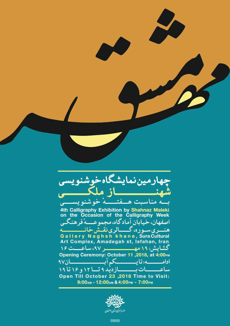 به گزارش روابط عمومی حوزه هنری استان اصفهان، این نمایشگاه روز پنج شنبه 19 مهر افتتاح شده است و تا روز سه شنبه 1 آبان در گالری نقش خانه حوزه هنری واقع در خیابان آمادگاه ، مجموعه فرهنگی هنری سوره به نمایش گذاشته می شود.