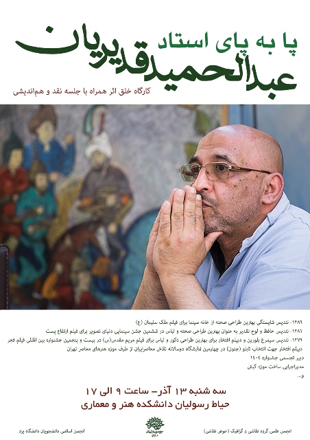 کارگاه آموزشیـتولیدی نقاشی و معماری با حضور استاد عبدالحمید قدیریان هنرمند برجسته عرصه هنرهای تجسمی و سینما در دانشکده هنر و معماری دانشگاه یزد برگزار میشود.