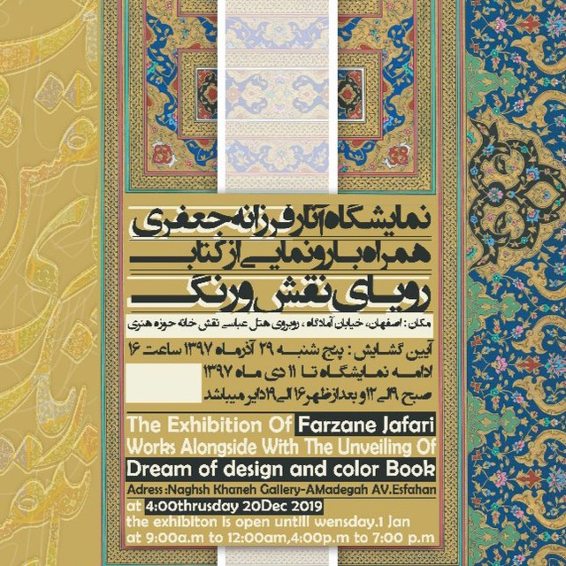 گفتنی است، زهرا(فرزانه) جعفری متولد 1354 در تهران است و از سال 1378 کار خود را با مینیاتور شروع کرد و پس از آن به تذهیب روی آورد، این هنرمند برجسته در بیش از 50 نمایشگاه داخلی و خارجی به صورت گروهی و انفرادی آثار خود را به نمایش گذارده است. وی همچنین سابقه تدریس در رشته های تذهیب، مینیاتور، طراحی سنتی در مراکز مختلف از جمله صنایع دستی، دانشگاه بزرگمهر و دانشگاه نقش جهان و... را دارد.
