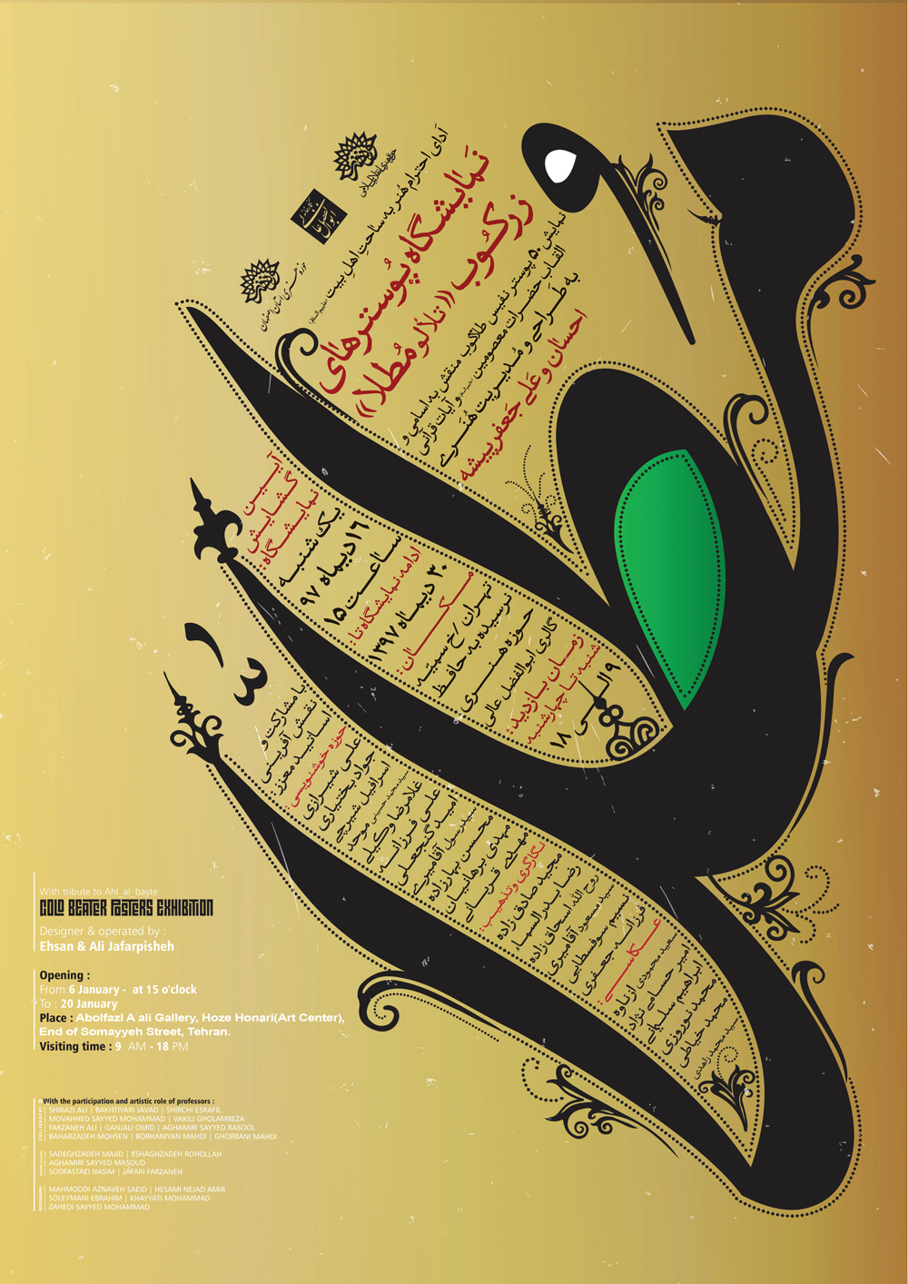 به گزارش روابط عمومی حوزه هنری استان اصفهان، در این نمایشگاه 50 پوستر نفیس طلاکوب ( و تکنیک های چاپی نفیس دیگر) ، منقش به اسامی و القاب حضرات معصومین (علیهم السلام) و آیات قرآنی، به طراحی و مدیریت هنری «احسان و علی جعفرپیشه »(بین سالهای 87 تا 97 ) ارائه می شود.