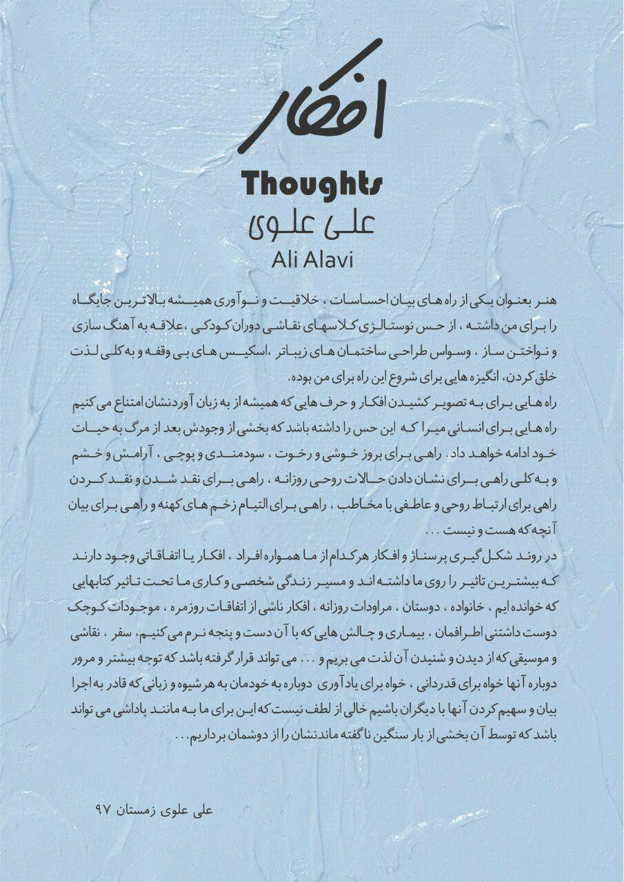 به گزارش روابط عمومی مرکز تجسمی حوزه هنری، علی علوی در رابطه با جمع آوری آثار و برگزاری نمایشگاه «افکار» گفت: هدف من از جمع آوری این مجموعه این بوده که بتوانم افرادی که در زندگی شخصی و کاری ام تاثیر داشتند، و یا فکرهایی که همیشه در روند زندگیام تاثیر گذار بودند را به تصویر بکشم، حالا فکرهایی که به طور عمومی بین اکثر افراد میتوانند مشترک باشند یا اینکه میتوانند شخصی باشند، کسانی که بیشتر از همه با آنها سر و کار داشتم، کسانی که کتابهایشان تاثیر زیادی بر روی من داشته، که برای هر کسی اگر بخواهد لیستی از آنها تهیه کند، قطعا میتواند یک لیست بلند بالایی برای خودش تهیه کند.