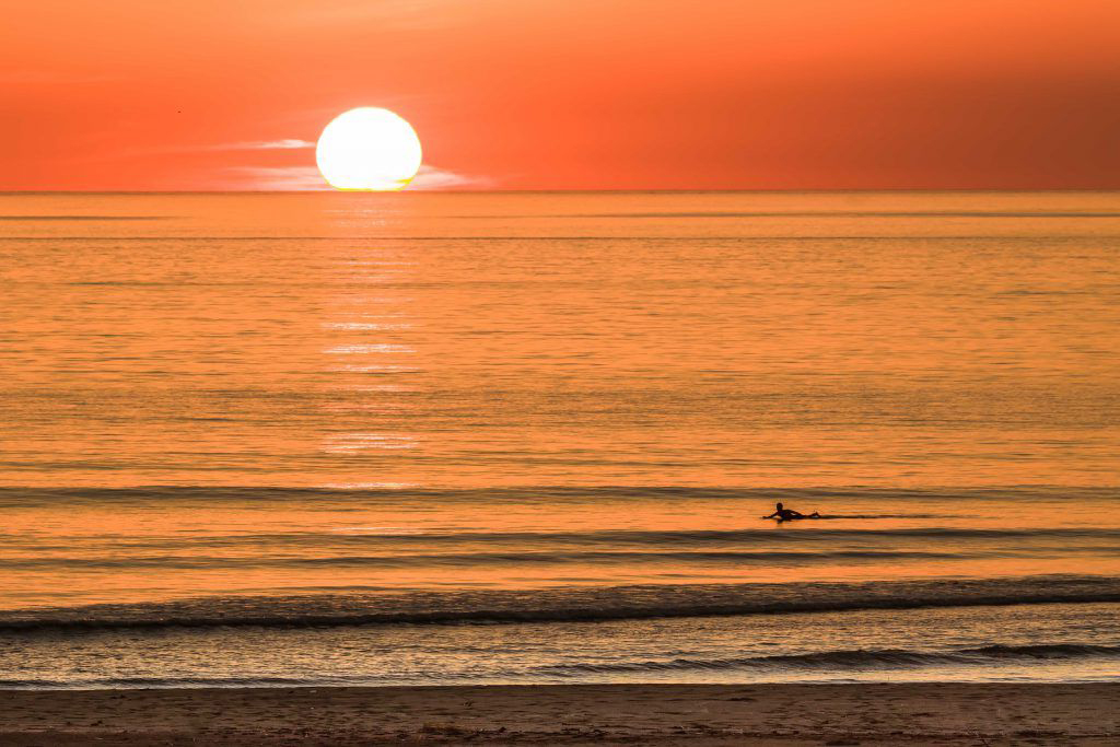 این تصویر با جنبههای تکنیکی عکاسی شروع میشود. ترکیببندی آن دارای تقارن خورشید در سمت چپ از بالا و موجسوار در سمت راست از پایین است. هر دوی آنها تقریباً روی خطوط قاعده یک سوم قرار دارند و در عکس رنگهای گرم و مشابه وجود دارد. همچنین جایگاه موج سوار به گونهای است که در امتداد مسیر خورشید در حال شنا کردن است.