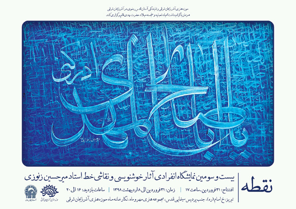 نمایشگاه انفرادی خوشنویسی و نقاشی خط «نقطه» آثار استاد میرحسین زنوزی از 31 فروردین تا هشتم اردیبشهت ماه از ساعت 16 الی 20 برای بازدید عموم مردم باز است.