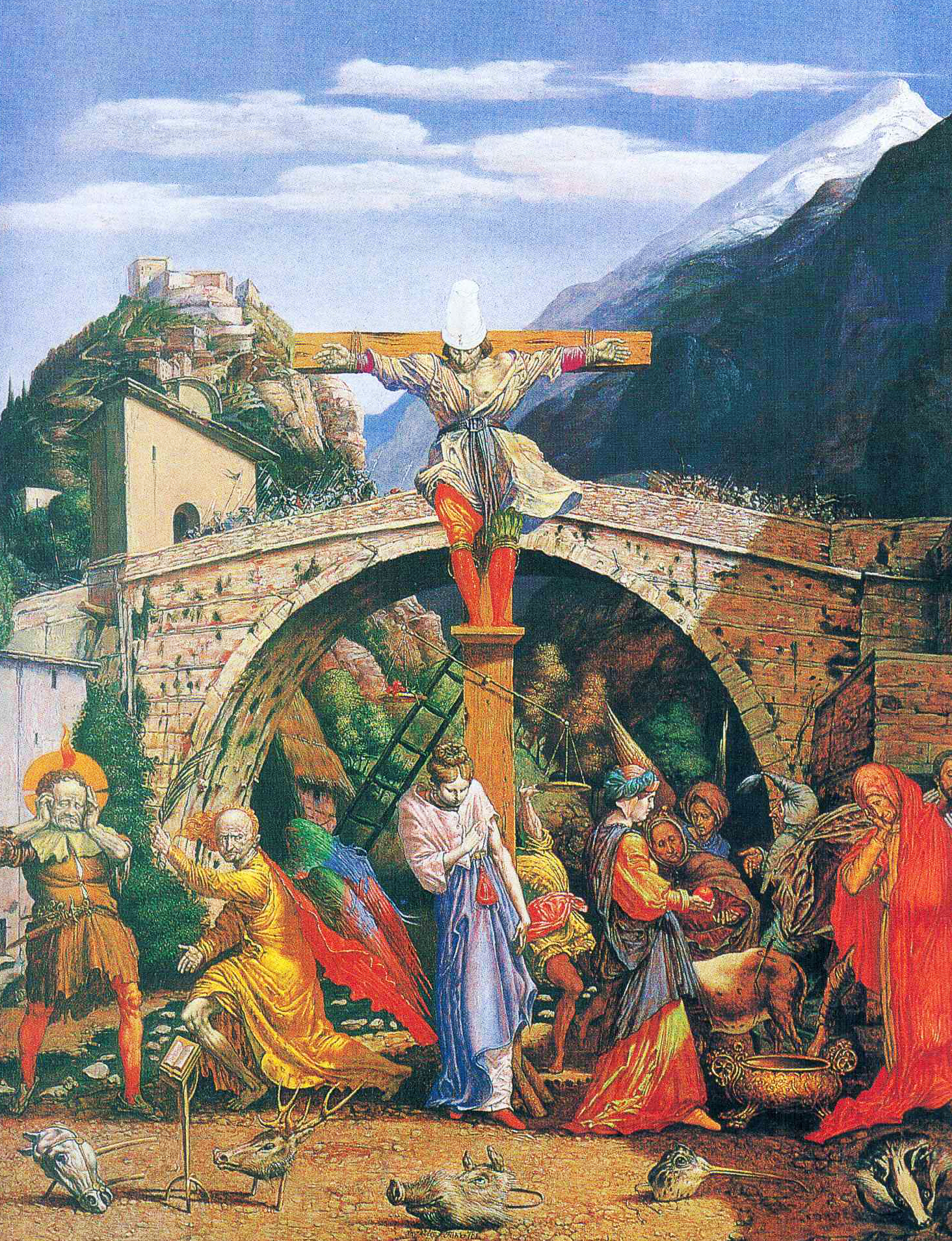 پس زمینه اثر، که می توان نقد سیاسی تندی بر جامعه ی روزگار نقاش دانست، کوه های شکوهمند آلپ است. در مرکز تابلو دلقکی به صلیب بسته شده است. در پایین پای او زنِ گناهکاری با کیسه پولِ رسواکننده ای ایستاده است. در عین حال که نشان زندگی ناپرهیزگارانه ی او، ماسک خوک، پیش پایش افتاده است. پشت سر او ترازوی عدالت با کفه ای از گل های قرمز، نماد دیگری از گناه شرم انگیز او، قرار دارد. در سمت راست «حوا» سیبی را به دلقکی در لباس راهبان می دهد، و حیوان قربانی شده زیر نگاه مادر «باکره» از فرط خونریزی در حال مرگ است. در سمت چپ، یک فرستاده خشمگین خداوند، در حالی که به کتاب مقدس اشاره دارد، شاخه نخل شهادت را به فرد برگزیده و منوری اعطا می کند- دهقانی مرعوب و بی رغبت. ماسک اسب واژگون شده چه بسا او را قهرمانی مسیحی جلوه دهد که نور و آرامش به ارمغان می آورد، و نیز بدعت گذاری که سرنوشتش در بالای صلیب به پایان خواهد رسید.