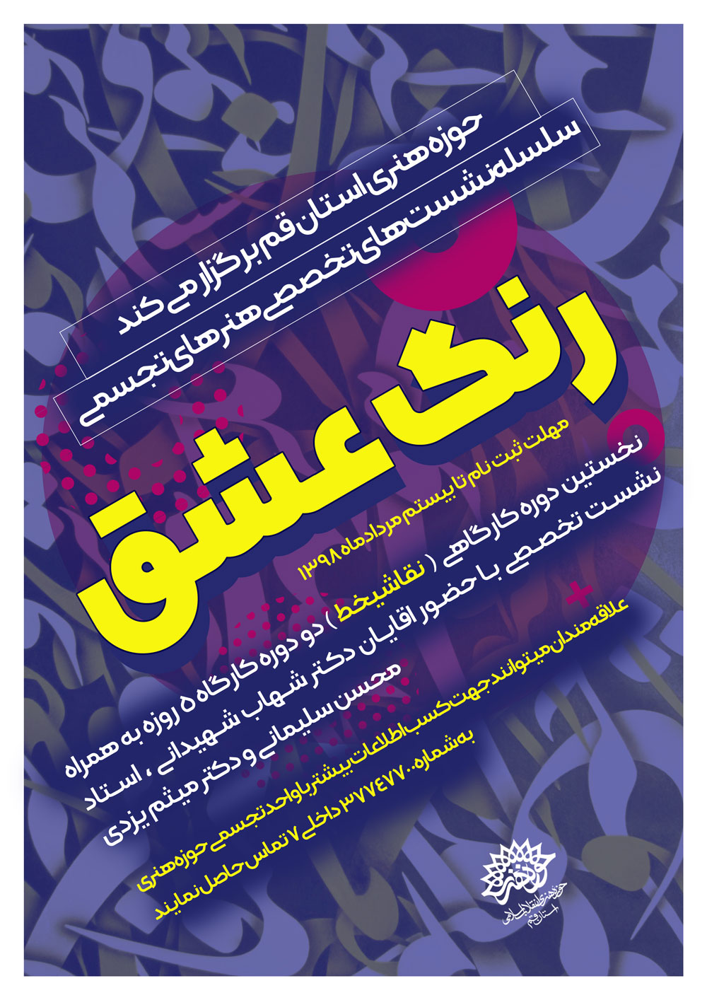 به گزارش روابط عمومی حوزه هنری استان قم، واحد هنرهای تجسمی حوزه هنری استان قم با هدف حمایت و دانشافزایی هنرمندان عرصه تجسمی برای برگزاری سلسله نشستهای "رنگ عشق" که با حضور اساتید مجرب و صاحب نظر هنر نقاشی و خط برگزار میشود، فراخوان ثبت نام داد. این دوره با حضور دکتر شهاب شهیدانی عضو هیأت علمی گروه تاریخ دانشگاه لرستان و مدرّس انجمن خوشنویسان، محسن سلیمانی پژوهشگر و مدرس دانشگاه در رشته نقاشی، گرافیک و خوشنویسی و دکتر میثم یزدی دکترای تاریخ هنر و مدرس دانشگاه برگزار میشود. در سلسله نشستهای "رنگ عشق" به صورت تئوریک مباحثی درباره نقاشی_خط مطرح میشود. سپس در 10 جلسه کارگاهی و با حضور هنرمندان رشتههای مرتبط، به صورت عملی به کار و تولید اثر پرداخته میشود. در پایانِ دوره محصولات این کارگاه به صورت نمایشگاهی در معرض دید عموم قرار خواهد گرفت. علاقمندان برای کسب اطلاعات بیشتر و ثبت نام در کارگاه میتوانند با شماره تلفن 37747700 (واحد تجسمی حوزه هنری قم) و یا شماره همراه 09360541200 تماس حاصل نمایند.