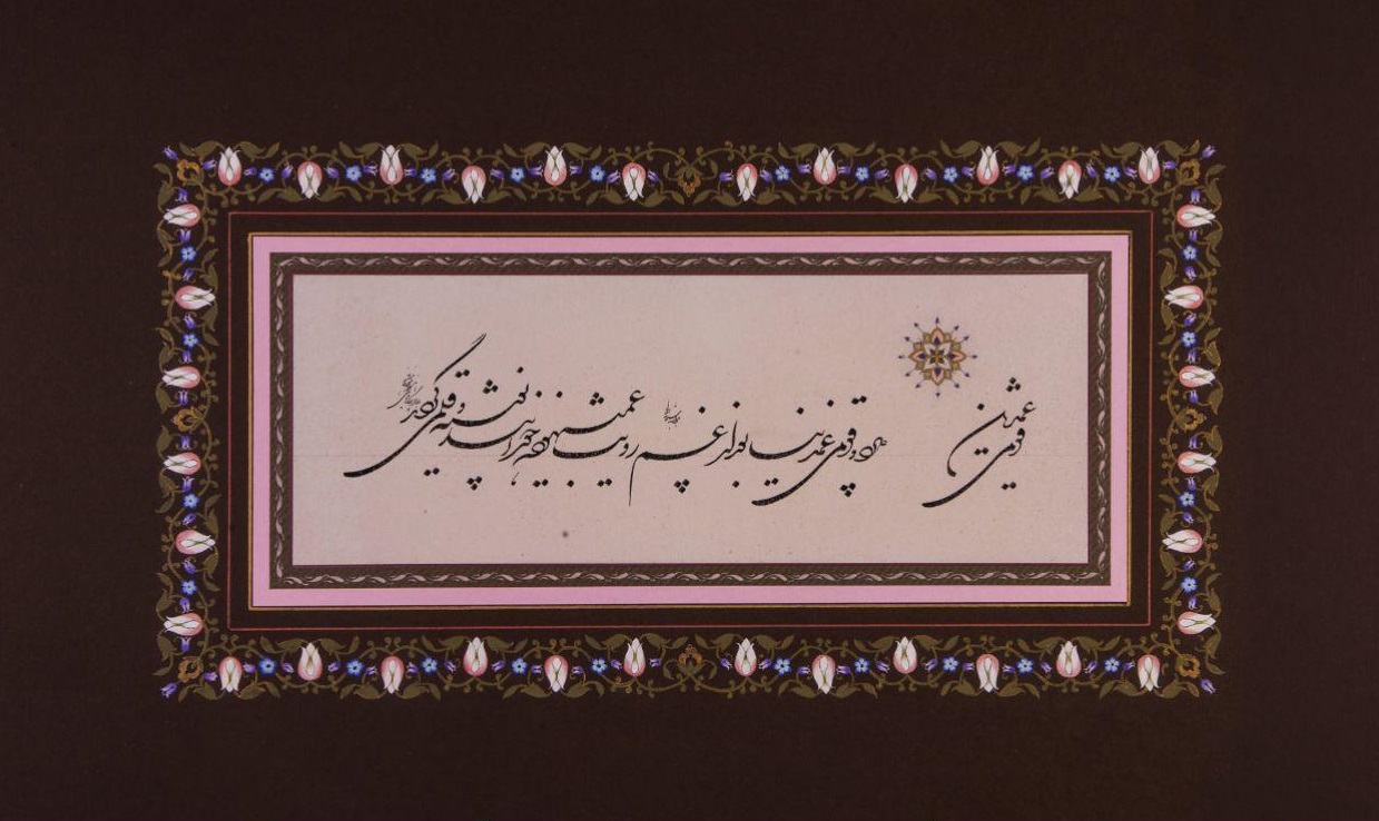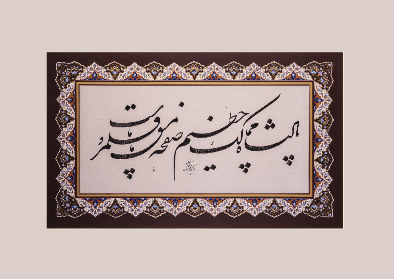 او با اشاره به اینکه مصحح اوراق امتحانات انجمن خوشنویسان ایران است، گفت: دغدغهای که در دو سال اخیر داشتم این بود که یک کتاب را به صورت کامل در یک صفحه نوشته و به عنوان اثر هنری به نمایش درآورم. این کار بسیار سخت است چون حجم کتاب خیلی زیاد است و گنجاندن آن در یک صفحه دشوار است، اما برایم جذاب بود که به عنوان مثال کل رباعیات خیام را بر روی یک صفحه کاغذ بیاورم و این کارها را با قلم دو دانگ و غبار مینویسم.