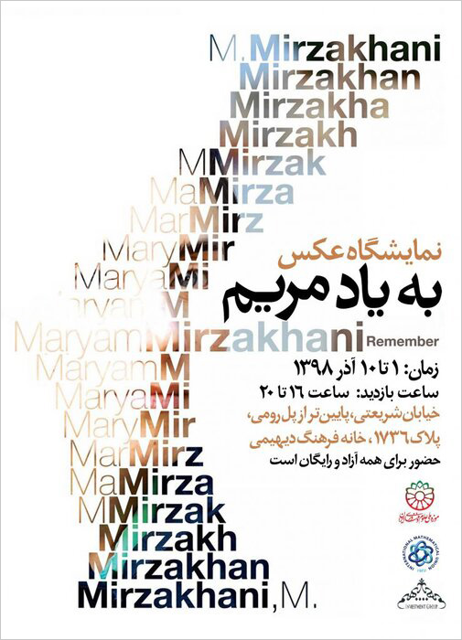 آیین گشایش نمایشگاه «به یاد مریم» جمعه اول آذر ۱۳۹۸ ساعت ۱۶ تا ۱۷ در خانه فرهنگ دیهیمی برگزار شد و نمایشگاه عکس به مدت ۱۰ روز در این خانه برپاست. علاقمندان میتوانند برای بازدید از نمایشگاه تا دهم آذر ماه به نشانی تهران، خیابان شریعتی، بالاتر از پل صدر، پلاک ۱۷۳۶ مراجعه نمایند.