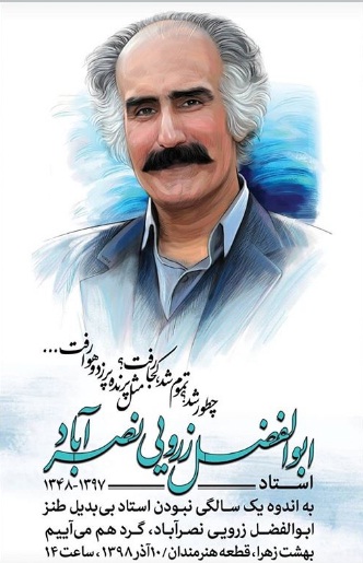 ابوالفضل زرویی نصرآباد پایهگذار دفتر طنز حوزه هنری و بنیانگذار نخستین شب شعر طنز در ایران با عنوان «در حلقه رندان» و صاحب آثار متعدد در حوزه ادبیات و طنز است که 10 آذرماه 1397 در سن 49 سالگی به دلیل عارضه قلبی در احمد آباد مستوفی تهران چشم از جهان فرو بست و در قطعه هنرمندان بهشت زهرا به خاک سپرده شد. روحش شاد و یادش گرامی باد.