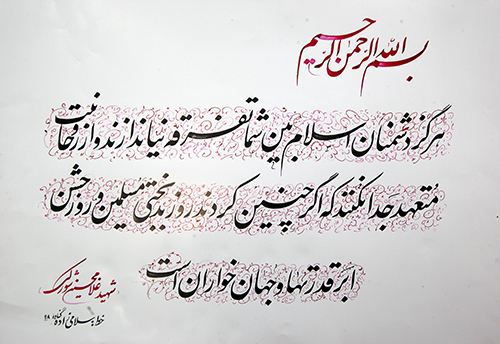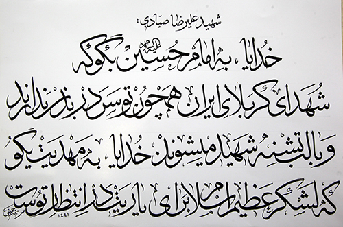 وی ادامه داد: در این کارگاه ۱۰ تن از خوشنویسان برجسته شهرستانهای استان بوشهر شرکت کردند که همزمان وصیتنامه شهدای استان مطالعه شد و همچنین براساس آن ها، آثار و جملات ارزشمندی مربوط به ایثار و شهادت در زمینه هنر خوشنویسی خلق شد.