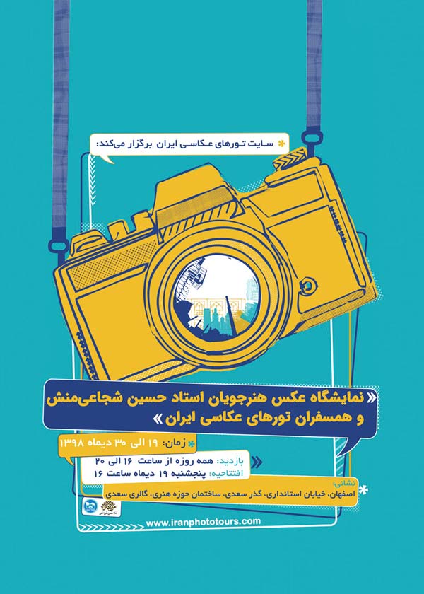 نمایشگاه عکس «هنرجویان استاد حسین شجاعی منش و همسفران تورهای عکاسی ایران» از روز 19 دیماه لغایت 30 دی ماه همه روزه در گالری شماره یک و دو سعدی واقع در خیابان استانداری، گذرسعدی، عمارت سعدی جهت بازدید عموم دایر است و علاقه مندان می توانند برای بازدید از ساعت 16 الی 20 به این مرکز مراجعه نمایند.